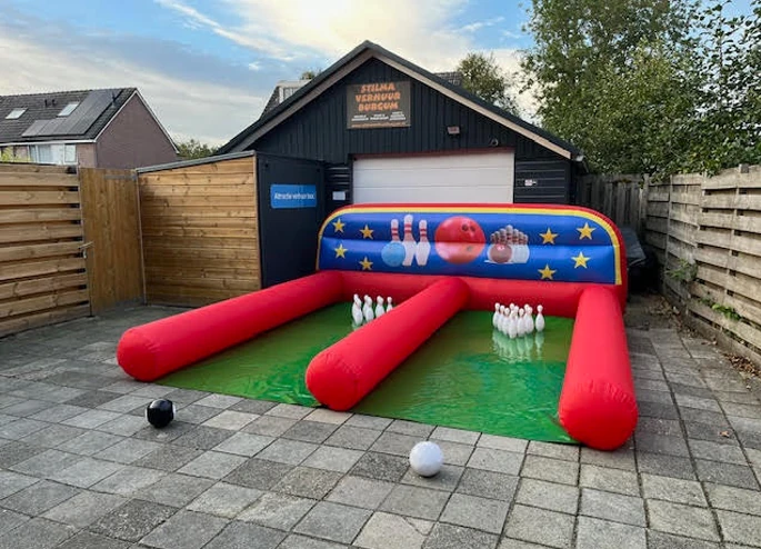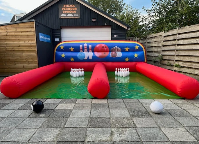 Beleef plezier met deze dubbele voetbal-bowlingbaan (4×4 meter)! Probeer met je traptechniek de kegels om te schieten.